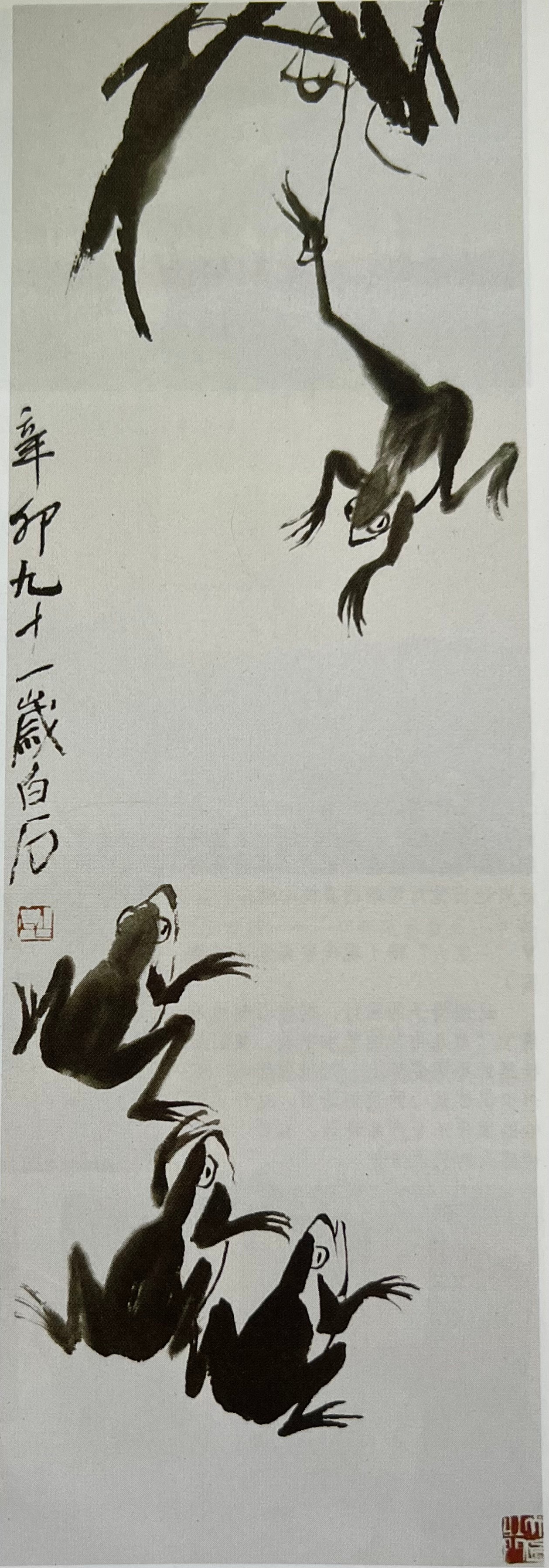 青蛙(中国画 现代)齐白石 《青蛙》是齐白石的水墨画小品,画面生动有趣,富有生活气息。画家在注重体现事物内在本质的同时,通过笔墨的变化,使小小的青蛙不仅形态逼真,并且富有神韵,青蛙的活泼、灵敏和机警跃然纸端。作品是画家主体精神的寄寓与传达,带着对自然的热爱与对生命的珍惜,齐白石将这份情感融入到了他众多的作品创作中,通过质朴的艺术语言和可爱的艺术形象,对后世国画产生了深远的影响。