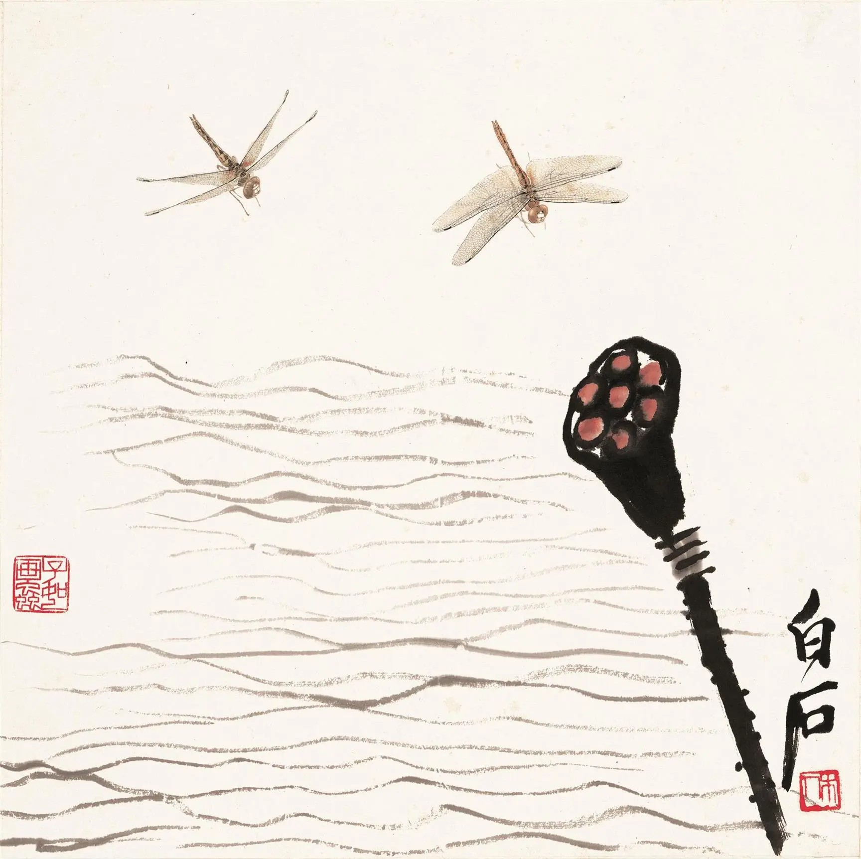 近代画家齐白石创作的中国画 《莲蓬蜻蜓》是近代中国画家齐白石创作的一幅纸本中国画。画中,四尺长的一条纵向线与一尺长的一条斜线的交叉,就完成了秋思的意韵,仿佛已简到不到再简,这却是齐白石的奇思妙构。 艺术鉴赏: 齐白石惯用书法般的用笔作画,他所描绘的蟹爪、荷叶、算盘和柴耙等,既是凝重而流畅的书法,也有确切而生动的形体。为追求形式因素在绘画中的作用,齐白石将书法的笔韵和篆刻的线条融于作品中,以笔墨自由的充满意味的形式代替了写实的表面形式的平庸。在《莲蓬蜻蜓》中,他运用篆书抑、扬、顿、挫充满的节奏感的笔法和简约的画面构成,使作品平添了许多意趣。如果不是酣畅淋漓、笔力逼人的运笔中那种种独具魅力的笔墨意味,《莲蓬蜻蜓》这样十分简单的造型是很难有独立的艺术价值的。